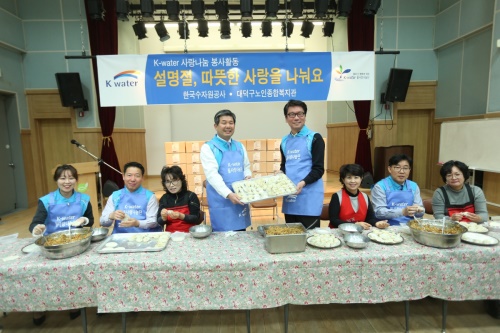 [글로벌이코노믹 최인웅 기자] 한국수자원공사(K-water)는 최계운 사장과 이영우 노동조합위원장 등 K-water 물사랑나눔단원 40여 명이 홀몸 어르신 등 생활형편이 어려운 이웃 120여 명을 대덕구 노인종합복지관으로 초청, 직접 빚은 만두를 비롯한 각종 명절음식을 대접하고, 거동이 불편해 복지관을 찾지 못하는 노인들을 위해 사골국물과 떡국 떡 등으로 구성된 ‘설 선물’을 복지관에 전달했다고 5일 밝혔다.