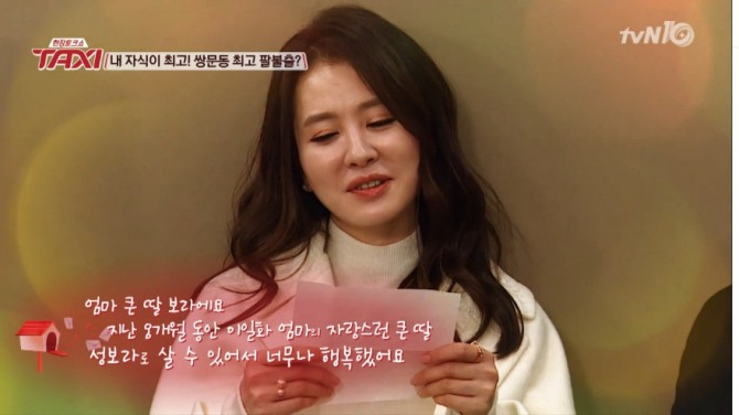 이미지 확대보기16일 밤 방송된 tvN '현장토크쇼 택시'에서는 쌍문동 엄마, 아빠인 이일화, 라미란, 김선영, 김성균, 류재명, 최무성이 출연한 가운데 이일화가 극중 맏딸 성보라 역의 류혜영이 직접 쓴 손편지를 받고 감격의 눈물을 흘렸다.