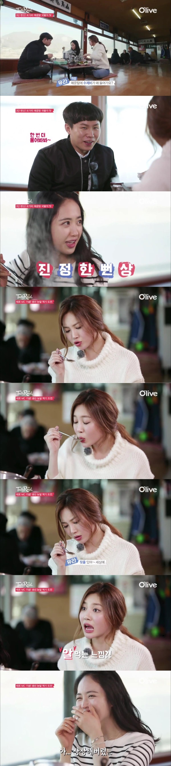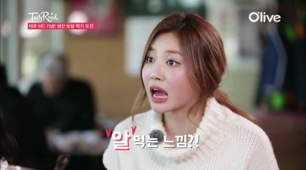 하지만 모든 상상력을 이겨내고 눈알을 맛 본 유라는 "알탕에 알을 먹는 느낌"이라고 맛표현을 했다.