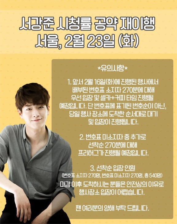 제작진은 "2월 16일 미흡한 행사 준비로 인해 여러분께 불편과 심려를 끼쳐드린 것에 대해 사과하는 의미로 서강준 시청률 공약이 2배 많은 팬여러분을 만날 수 있도록 재이행한다"고 전했다. 이어 "안전상의 이유로 인해 행사 인원을 제한하는 점 모쪼록 양해 부탁드리며, 정확한 행사 장소 및 시간은 2월 23일 (화요일) 중 다시 한 번 공지하겠다"고 덧붙였다.
