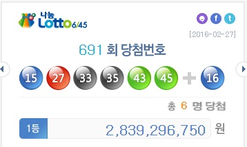 [글로벌이코노믹 이태준 기자] 나눔로또 제691회 추첨에서 15, 27, 33, 35, 43, 45가 1등 당첨번호로 뽑혔다.