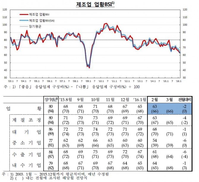 한국은행이 29일 발표한 '2016년 2월 기업경기실사지수(BSI) 및 경제심리지수(ESI)'에 따르면 이번 달 제조업의 업황BSI는 63으로 지난 1월보다 2포인트 떨어졌다.