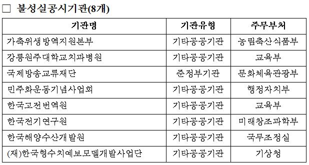 불성실 공시기관은 가축위생방역지원본부, 강릉원주대치과병원, 국제방송교류재단, 민주화운동기념사업회, 한국고전번역원, 한국전기연구원, 한국해양수산개발원, 한국형수치예보모델개발사업단 등 8곳이다.