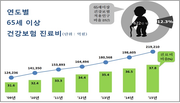 한편, 건강보험 적용을 받는 진료비(비급여분 제외)는 개인부담금과 건강보험부담금을 합해 57조9593억원으로 2014년 대비 6.7%증가했다.