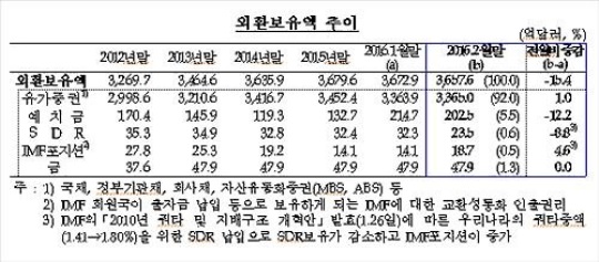 이미지 확대보기4일 한국은행이 발표한 2016년 2월말 외환보유액 자료에 따르면 2월말 현재 외환보유액은 3657억6000만 달러로 나타났다. 작년 10월 말 외환보유액 3696억 달러를 기록한 이후 4개월 동안 지속적으로 감소추세를 보였다.