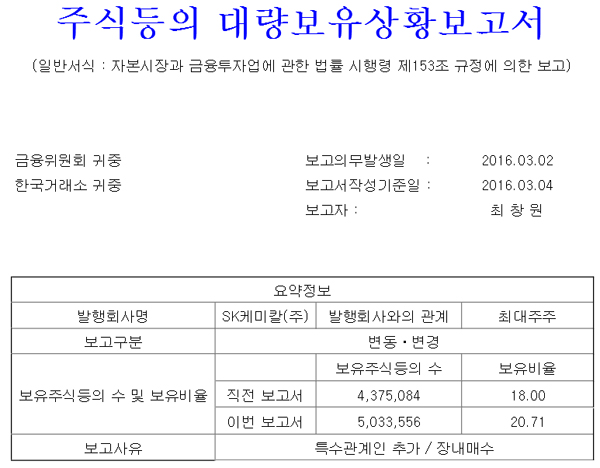 SK케미칼 "최창원 부회장 특수관계인 지분율 20.71%로 높아져"