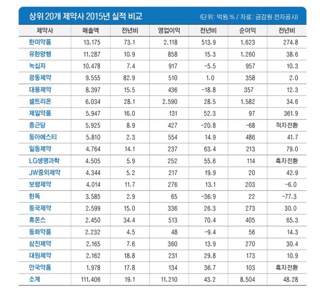 매출액 순위로는 광동제약이 9555억원, 대웅제약이 8397억원, 셀트리온6034억원, 제일약품5947억원, 종근당5925억원, 동아에스티5810억원, 일동제약4764억원, LG생명과학4505억원, JW중외제약4344억원을 기록했다.