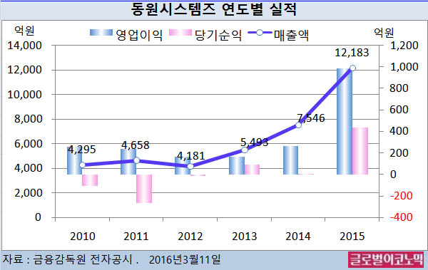 이 회사의 2015년 매출액은 1조2183억원으로 전년의 7546억원에 비해 무려 61.4% 증가했다. 영업이익도 2014년의 267억원에 지난해에는 985억원으로 269.3% 급신장했다.