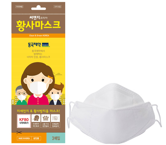 동국제약의 황사마스크는 4중구조의 고효율 필터를 사용했으며, 코 부분이 편안하게 밀착되어 착용감도 좋다. 미세먼지 여과효율을 높이는 제조과정을 거쳐 만들어졌기 때문에 황사가 잦아지고 미세먼지 등 공기 중 유해물질이 많아지는 3월부터 5월에 유용하게 사용할 수 있다.