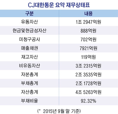 금융감독원 전자공시에 따르면 지난해 9월 말 현재 CJ대한통운이 보유하고 있는 현금 및 현금성자산은 888억원에 불과한 것으로 나타났다.