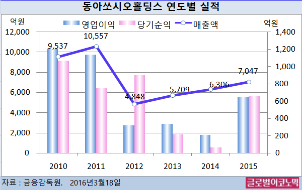 지난해 동아쏘시오홀딩스의 개별기준 영업실적이 악화된 것은 동아제약의 투자수요증가로 지주사에 대한 배당을 크게 줄인 결과다.
