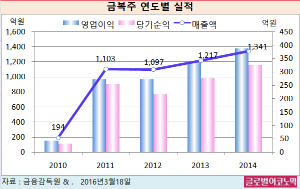 금복주는 지난 2014년 매출액 1341억원, 영업이익 388억원, 당기순이익 327억원을 기록했다.