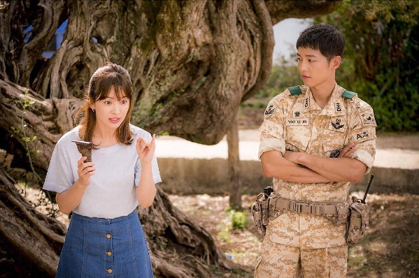 이미지 확대보기두 사람은 KBS2 수목드라마 '태양의 후예'에 유시진 대위와 외과의사 강모연 역으로 함께 호흡을 맞추고 있다.