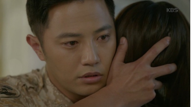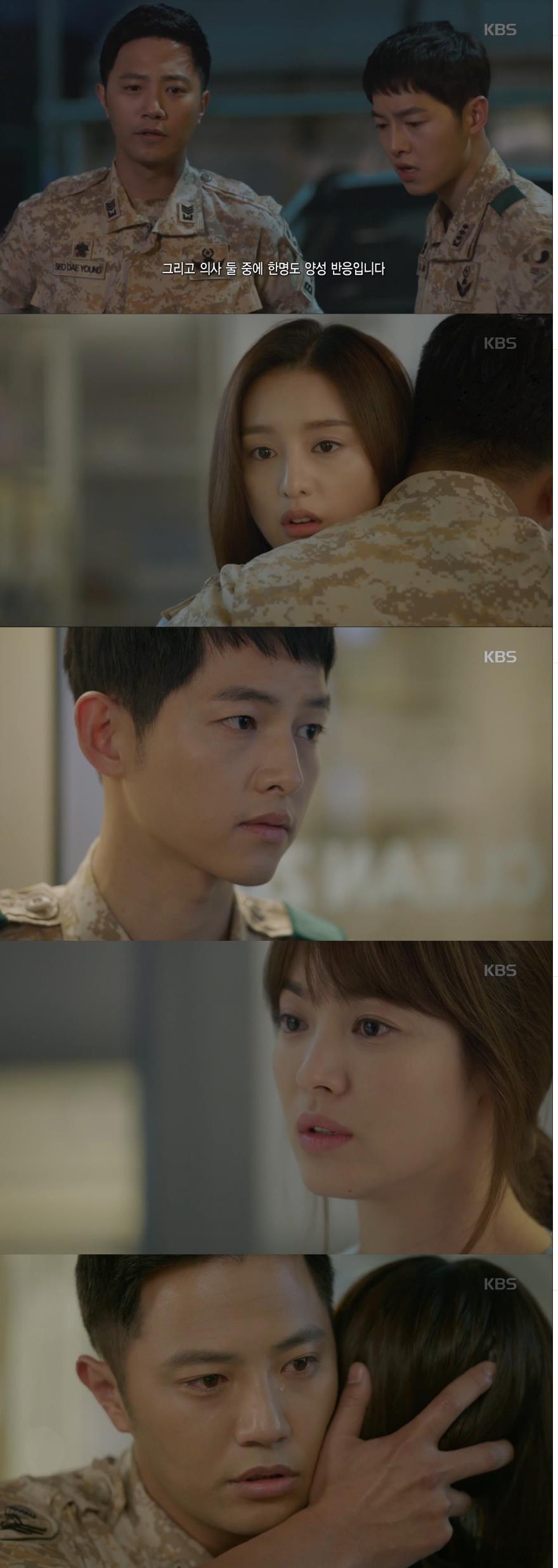유시진(송중기 분)과 서대영은 미군 부대에서 혈액 검사 결과 진소장과 윤명주가 바이러스에 감염된 사실을 확인했다. 유시진과 나란히 걸어오다가 서대영이 격리실 문을 격하게 열고 들어와서 다짜고짜 윤명주 중위를 끌어안았다.