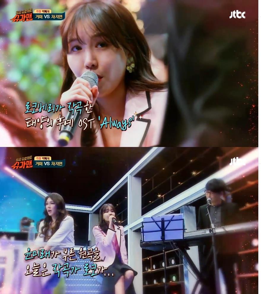 이미지 확대보기29일 밤 방송된 JTBC '투유 프로젝트-슈가맨'에서는 유희열 팀의 슈가맨으로는 플라워의 고유진이 출연했고, 쇼맨으로 차지연, 프로듀서 로코베리가 등장했다. 유재석 팀은 슈가맨으로 러브홀릭의 지선, 쇼맨으로 거미와 프로듀서 조커가 등장했다.