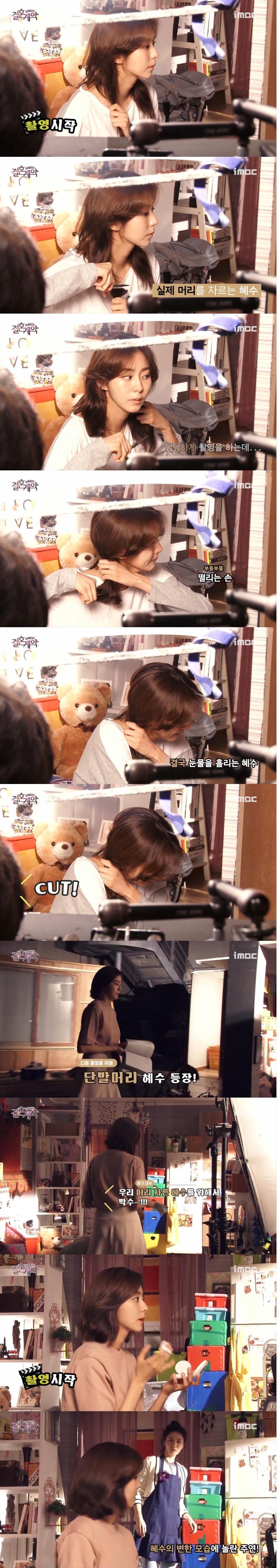 이미지 확대보기MBC 주말극 '결혼계약' 제작진이 공개한 메이킹 영상에 따르면 극중에서 뇌종양에 걸린 강혜수역으로 열연하고 있는 유이는 실제로 자신의 머리카락을 직접 자르는 투혼을 보였다.