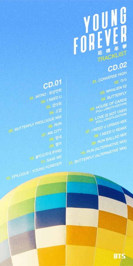이번 스페셜 앨범에는 '화양연화' 시리즈 앨범 수록곡과 리믹스 버전, 신곡 '에필로그: 영 포에버(EPILOGUE: Young Forever)' '불타오르네(Fire)' '세이브 미(Save ME)' 등 모두 23곡이 담겼다.