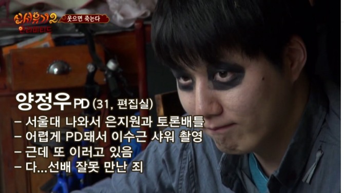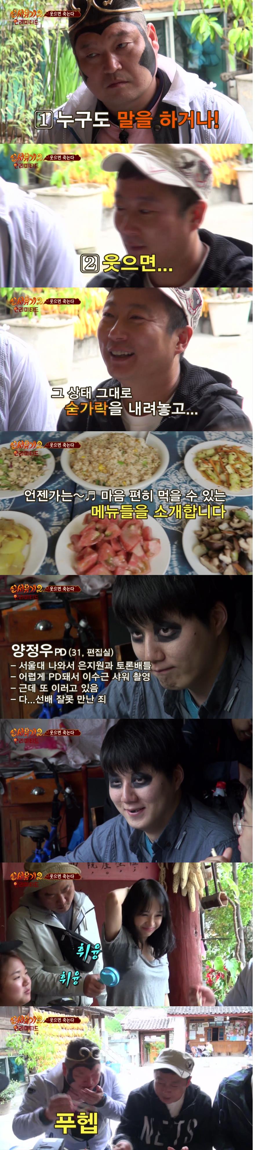 선글래스를 벗고 밥을 먹으라는 요청에 양정우 PD는 팬더처럼 눈을 검게 칠한 모습에 앞니까지 검게 칠한 모습을 드러내며 멤버들을 공격했다.