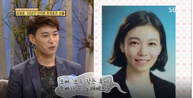김원준은 "그 귀걸이는 1995년으로 미국 LA 공연을 마치고 구입한 것으로 세상에 하나뿐인 핸드 매이드 귀걸이"라고 소개했다. 무려 20년이나 소장하고 있던 귀걸이를 결혼을 결심한 후에 꺼내 들고 프로포즈를 했다는 것.
