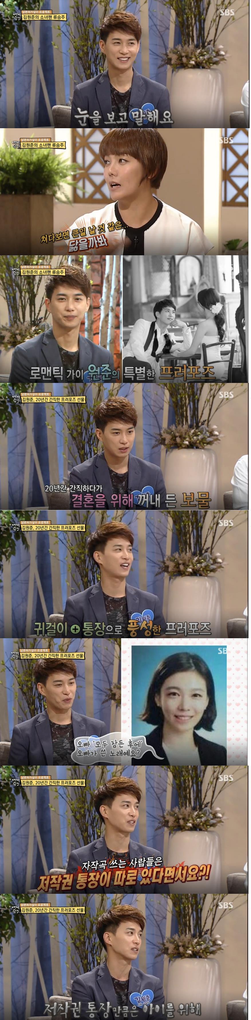 "프로포즈 당시 무슨 말을 했느냐?"는 질문에 김원준은 "대학교에 교원으로 재직중으로 차곡차곡 모아가는 월급통장이 있었다"며 "귀걸이와 통장을 같이 건네며 프로포즈를 했다"고 밝혀 시청자들의 부러움을 샀다.