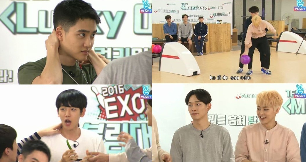 팀 구호도 재밌었다. '럭키원 팀'(백현, 디오, 레이, 세훈)은 "변! 오! 장! 도! 크로스!"라고, '몬스터 팀'(시우민, 첸, 카이, 수호)은 "볼링장에 이미 넌 빠져들었고~"라고 노래를 부르며 구호를 외쳤다.