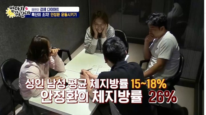 안정환은 몸무게 측정결과 86kg이 나오자 '나는 기계를 안 믿는다"며 며칠 전에도 84kg이었는데 말이 안 된다고 부인했다. 이 모습을 지켜보던 이혜원은 "체지방 검사 결과 정상으로 나오면 잔소리를 하지 않겠다"는 쿨한 모습을 보였다.
