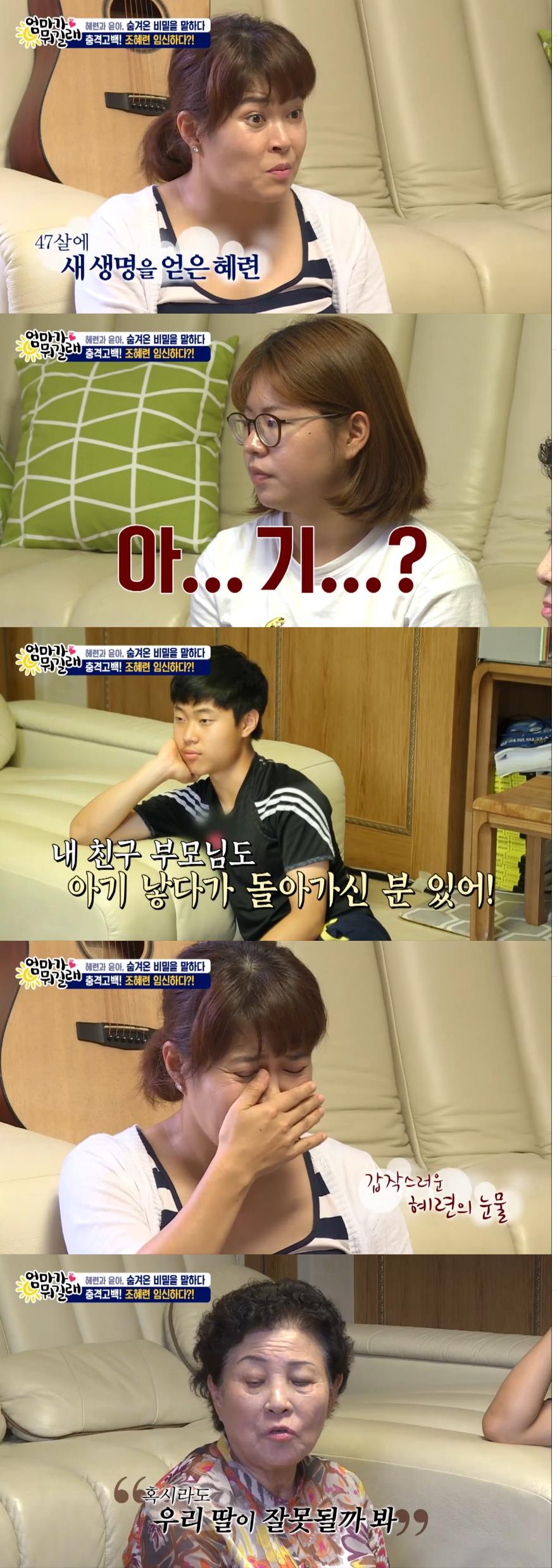 이미지 확대보기7일 밤 방송된 TV조선 '엄마가 뭐길래' 35회에서는 조혜련은 "재혼 후 47살에 임신했으나 나중에 아기가 잘못됐다"는 사실을 딸 윤아와 아들 우주에게 고백해 충격을 주었다.