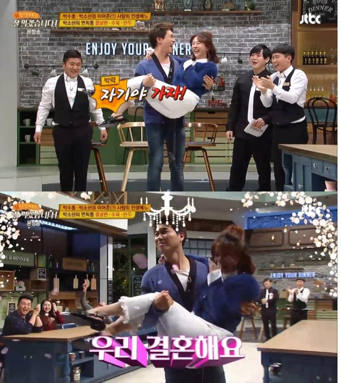 개인기를 하라는 말에 박수홍은 "자기야 가자"며 박소현의 손을 덥석 잡더니 결혼식 코스프레로 박소현을 반쩍 들어 성큼성큼 앞으로 안고 나갔다. 박소현은 부끄러워서 얼굴이 빨개졌고 박수홍은 환호하는 패널들을 향해 "일단 전화번호를 따도록 하겠습니다"라고 호기를 부렸다.