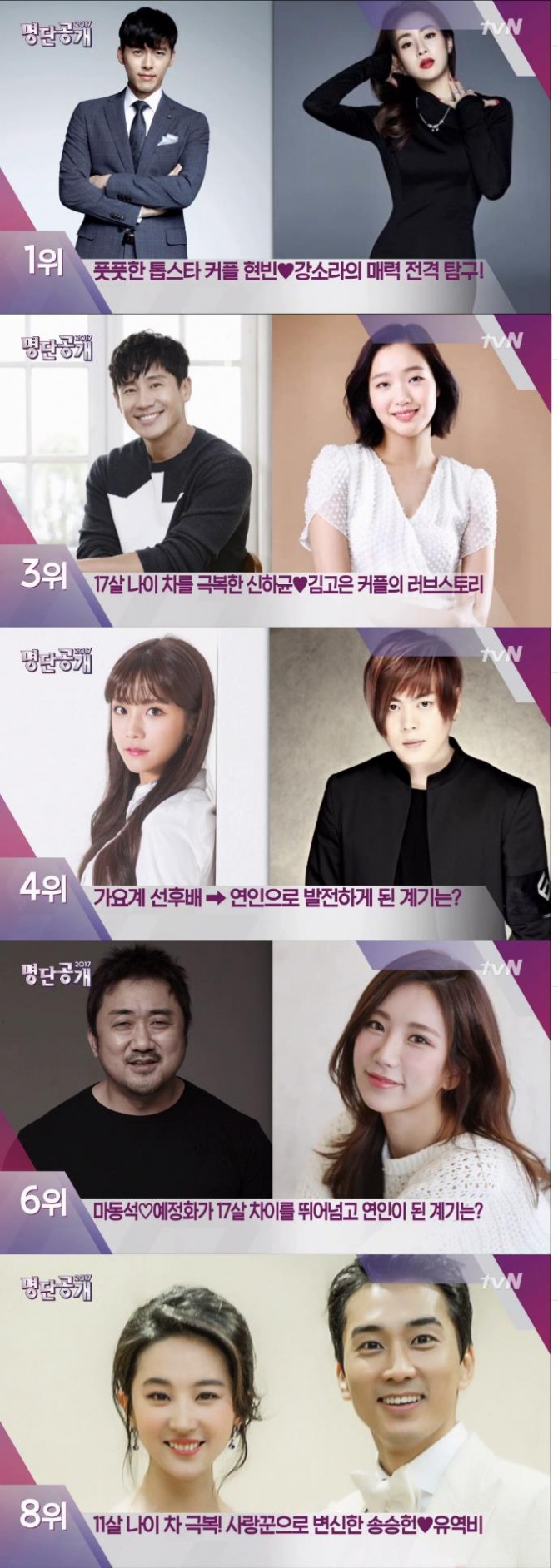 이미지 확대보기9일 방송된 tvN '명단공개' 2017에서는 '연예계 최강 나이 파괴 커플' 순위가 발표된 가운데 가장 최근 열애 사실을 발표한 현빈과 강소라가 1위를 차지했다.