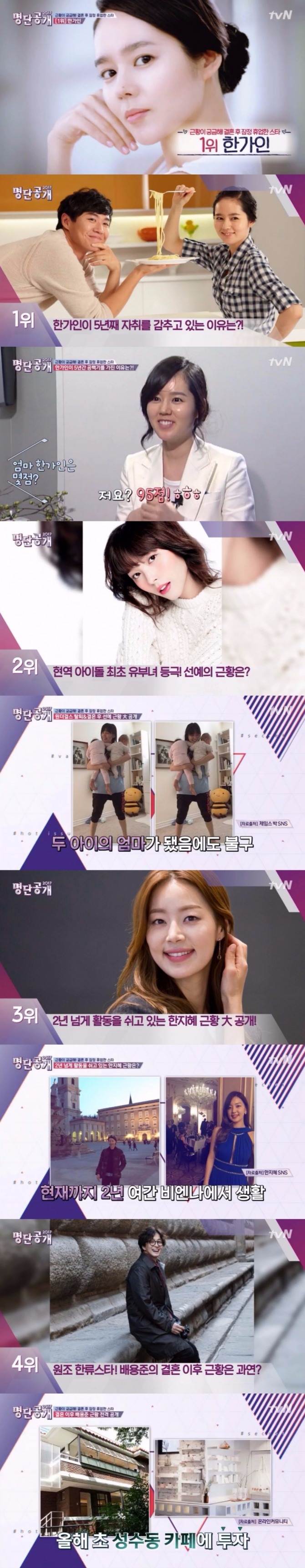 이미지 확대보기13일 0시 20분 방송된 케이블 채널 tvN '명단공개 2017'에서는 '근황이 궁금해지는 결혼 후 잠정 휴업한 스타' 순위가 공개된 가운데 한가인이 복귀가 가장 기다려지는 스타 1위에 올랐다.