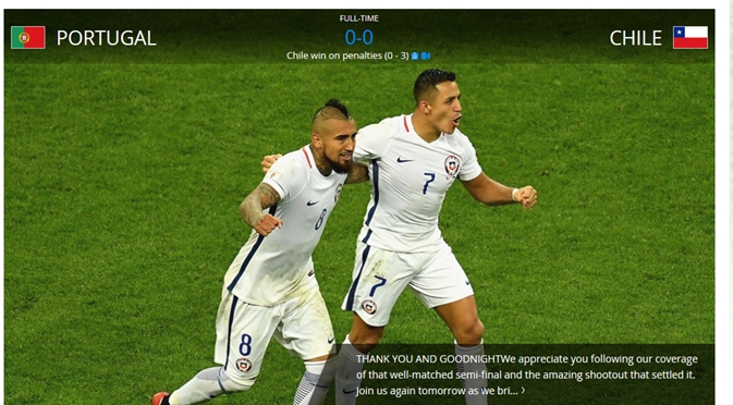 칠레는 29일(한국시간) 러시아 카잔의 카잔 아레나에서 열린 포르투갈과 대회 준결승에서 120분 연장 혈투 끝에 0-0으로 비긴 뒤 승부차기에서 3-0으로 승리해 역대 첫 결승에 진출했다.