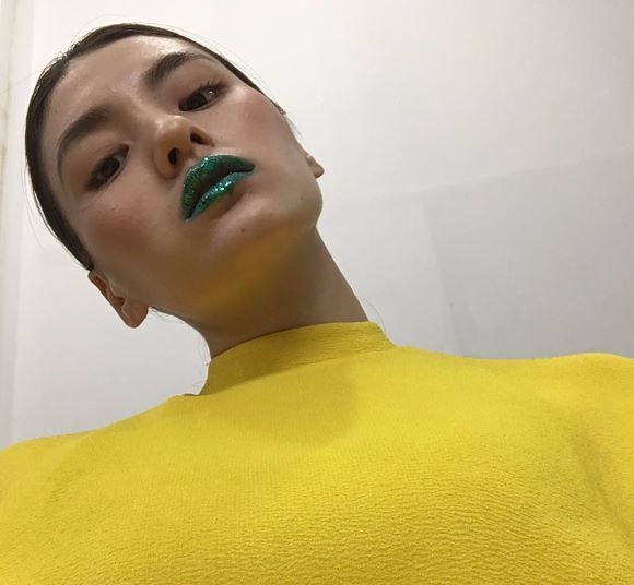 12일 김용지 인스타그램에는 반짝이는 초록색 립스틱을 바르고 그윽한 눈빛으로 카메라를 응시하는 김용지의 사진이 게재됐다.