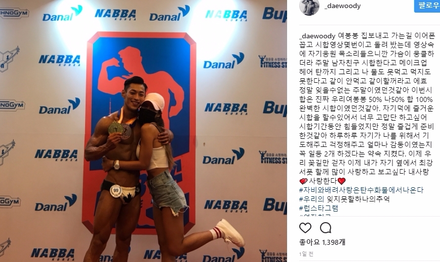 이어 "이번시합은 진짜 우리여봉봉 50% 나50% 합 100% 완벽한 시합이였던것같아"라며 "자기덕에 즐거운 시합을 할수있어서 너무 고맙단 하고싶어 시합기간동안 힘들었지만 정말 즐겁게 준비한것같아 하루하루 자기가 나를 위해서 기도해주고 걱정해주고 얼마나 감동이였는지 꼭 일등 2개 하겠다는 약속 지켰다"라고 말했다.