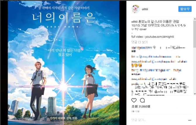 이미지 확대보기올티는 지난 5월13일에 인스타그램에 '혼모노의 길 ('너의 이름은' 관람 10/10) 기념 '아무것도 아니야 (なんでもないや)' cover'를 올렸다.