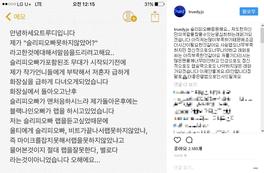 이미지 확대보기트루디는 29일 인스타그램에 "안녕하세요 트루디입니다"라며 "슬리피 오빠 못하지 않았어?라는 발언에 대해 말씀을 드리려 한다"고 밝혔다.