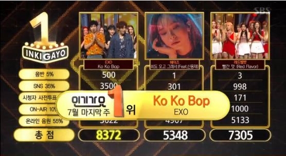 이미지 확대보기30일 오후 방송된 SBS 인기가요에서 엑소는 타이틀곡 ‘Ko Ko Bop’으로 레드벨벳의 ‘빨간 맛’ 헤이즈의 ‘비도 오고 그래서’를 큰 차이로 따돌리고 7월 마지막 주 1위에 올랐다.