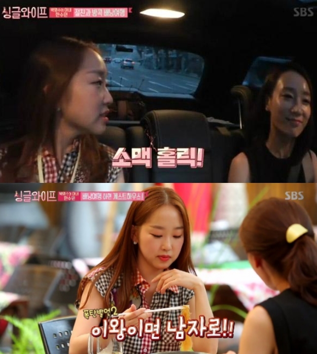 이미지 확대보기지난 2일 방송된 SBS 새 예능프로그램 ‘싱글와이프’에는 박명수의 아내 한수민이 학창시절 못다 한 한을 풀기 위해 친구와 방콕여행을 떠났다.