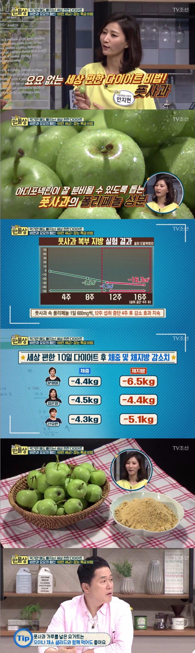 안지현 전문의는 요요현상 없는 풋사과 다이어트를 소개했다. 풋사과에는 폴리페놀 성분이 들어 있다는 것. 우리 몸의 지방 세포에는 여러 가지 호르몬이 들어 있는데, 그 중의 하나가 아디포넥틴이다. 아디포넥틴은 지방세포에서 분비하는 단백질의 일종으로 내장 지방을 연소시켜 동맥경화를 방지하고 혈관내부를 청소한다. 그런데 살이 찔수록 아디포넥틴 분비량이 줄어든다는 것. 풋사과의 폴리페놀 성분이 아디포넥틴이 잘 분비되도록 도와주는 역할을 한다.
