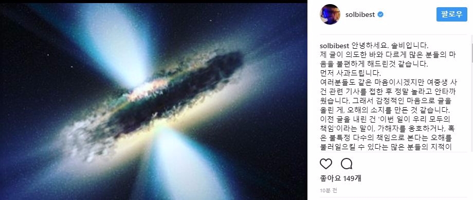 이미지 확대보기4일 솔비는 자신의 SNS에 이번 사건을 두고 “우리 모두의 책임”이라는 글을 올렸다가 가해자를 옹호했다며 네티즌의 거센 비난을 받았다.