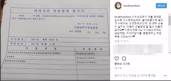 곽현화는 지난 6월 30일 자신의 인스타그램에 한 장의 사진을 게시하며 “이수성 감독이 저를 명예훼손으로 고소했었는데 혐의없음으로 결과가 나왔어요”라며 심경을 고백한 바 있다.