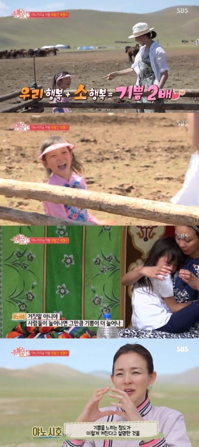 이미지 확대보기9일 방송된 SBS '추블리네가 떴다'(이하 '추블리네')에서는 야노 시호와 추사랑이 외양간 청소를 하는 모습이 그려졌다. 앞서 추사랑은 몽골 친구들과 어울리지 못하고 혼자만의 시간을 갖고 싶어 했다. 이에 야노 시호가 딸에게 기쁨은 함께 하면 더 커진다고 조언했다.