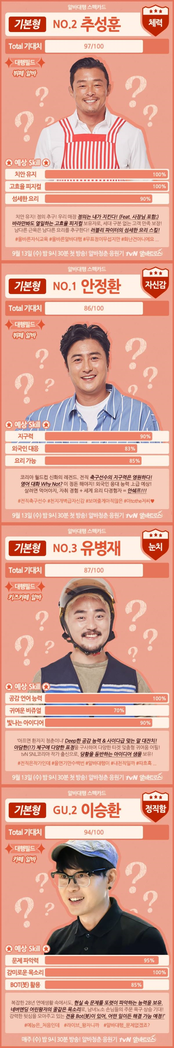 이미지 확대보기[수요일 예능] tvN '알바트로스' 이런 뜻이었어? 알바청춘응원에 나선 뷔페 추성훈·안정환 VS 빵집 유병재·이승환...9월 20일(수요일) TVN 편성표에 따르면 오후 9시 30분 TVN 수요일 예능 ‘알바트로스’가 방송된다. 추성훈, 안정환, 유병재가 출연하는 TVN 수요일 예능 ‘알바트로스’ 2회에서는 일일 알바생으로 가수 이승환이 출연해 눈길을 끈다. /사진=TVN 수요일 예능 프로그램 '알바트로스' 알바스펙카드 스틸컷 캡처 (추성훈, 안정환, 유병재, 이승환)