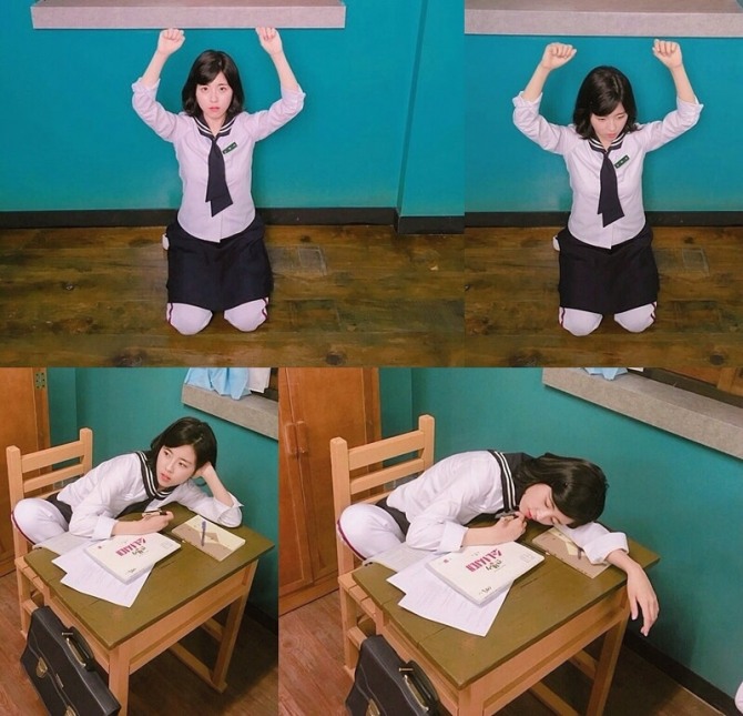공개된 사진 속 도희는 교실 복도에 꿇어 앉아 벌을 서고 있다. 평소답지 않은 기가 죽은 듯 시무룩한 표정이 웃음을 자아낸다.