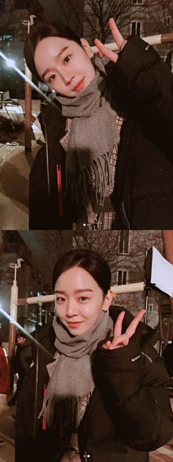 공개된 사진속의 신혜선은 촬영 현장에서 스태프들과 조명 등을 배경 삼아 왼손으로 V를 그리며 환한 미소를 짓고 있다.