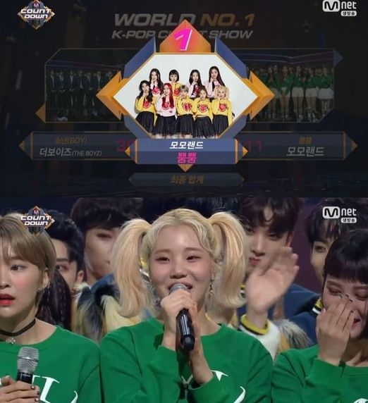이미지 확대보기이날 모모랜드는 ‘더보이즈'와 1위를 두고 경쟁했다. 1위 발표 이후 모모랜드 멤버들은 감격을 감추지 못하고 눈물을 흘렸다. 멤버 주이는 “감사합니다. 엠카운트다운 그리고 저희 모모랜드 가즈아”라고 유행어를 이용한 수상소감을 말했다.