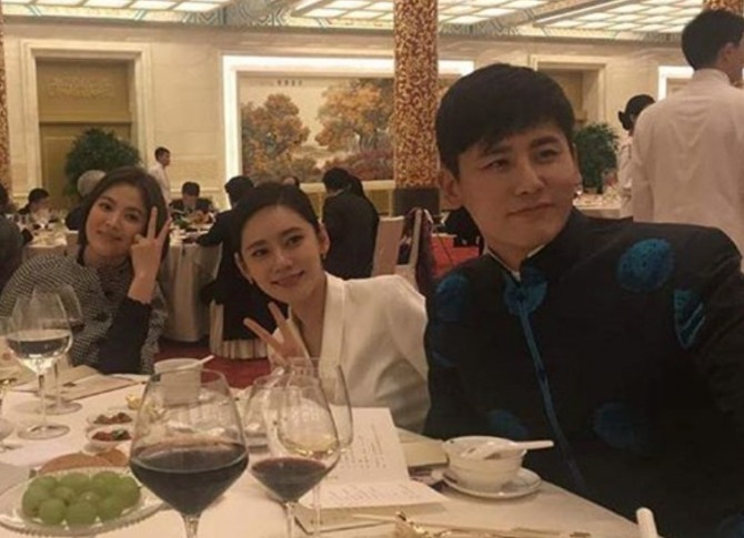 이미지 확대보기해당 사진은 지난해인 2017년 12월 13일 개최된 항중 국빈만찬 장에서 추자현 우효광 커플이 송혜교와 나란히 앉아 인증샷을 담은 모습이다.