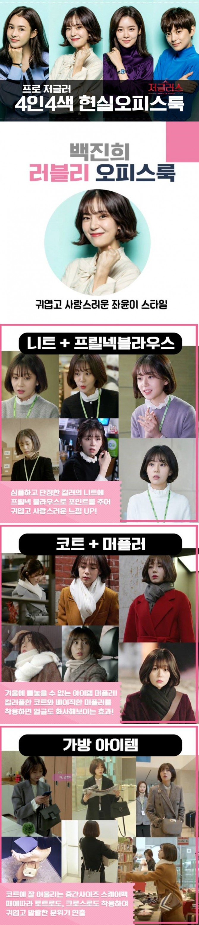 그레이나 블랙, 연보라 등 심플하고 단정한 니트에 프릴 넥 블라우스로 포인트를 줘 귀엽고 사랑스러운 분위기를 연출했다. 여기에 화사한 얼굴이 돋보이도록 레드나 버건디 등 컬러풀한 코트에 아이보리나 짙은 브라운 색등 베이직한 머플러를 착용했다.