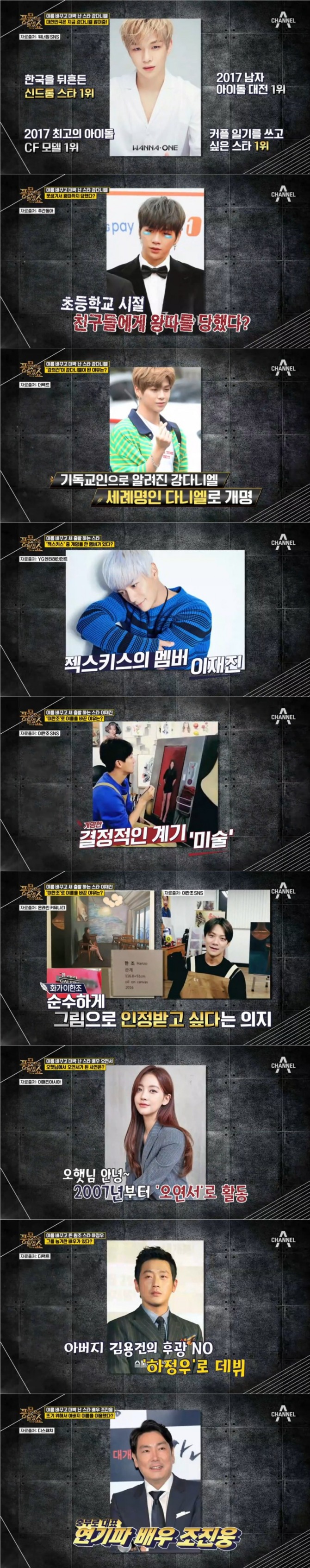 이미지 확대보기5일 밤 방송된 채널A '풍문으로 들었쇼'에서는 '이름 바꾸고 대박 난 스타'로 워너원 강다니엘, 젝스키스 이재진, 배우 오연서, 하정우, 조진웅, 가수 최창민 등이 소개돼 눈길을 끌었다.