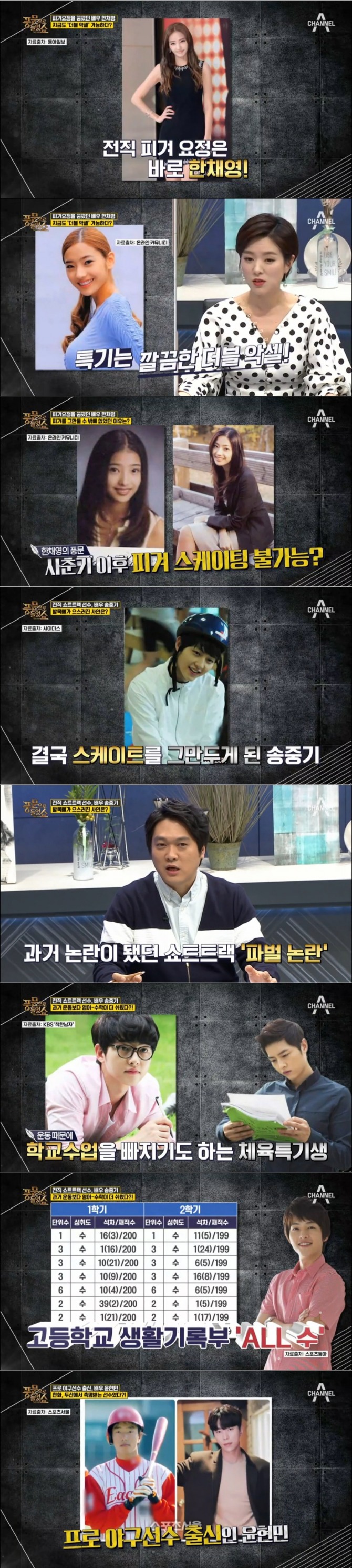 이미지 확대보기19일 밤 방송된 종합편성채널 채널A '풍문으로 들었쇼'(이하 '풍문쇼')에서 한채영은 데뷔 전 미국에서 19살까지 피겨선수로 활약했고 송중기는 쇼트트랙 선수로 활동했던 이색 경력이 조명됐다.
