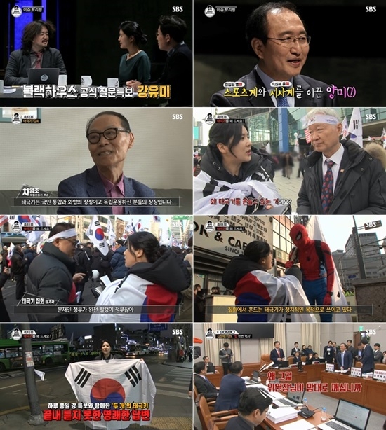 강유미는 "같은 태극기지만, 바라보는 것에 따라 의미가 달라지는 것 같다"며 아쉬움을 표했다. 김어준은 태극기 집회를 취재한 강유미의 활약에 대해 "이달의 종군기자상 감"이라고 칭찬하며, "박정희와 함께한 자신의 세대가 부정당하는 상실감 때문에 태극기를 흔드는 것"이라는 자신의 견해를 밝히기도 했다.